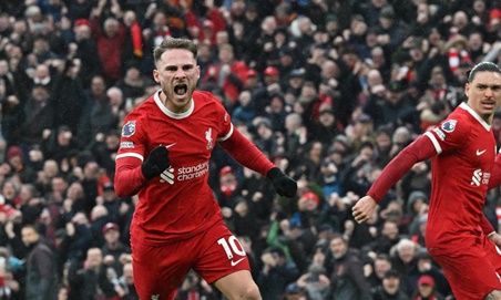 "หงส์แดง" นำตั้งแต่ต้นเกมแล้วโดนตีเสมอ แต่นาที 77 แม็ค อัลลิสเตอร์ ซัดนอกเขตเสียบสามเหลี่ยม ปลดล็อคให้ทีมกุมความได้เปรียบอีกรอบ ก่อนเอาชนะไปในที่สุด