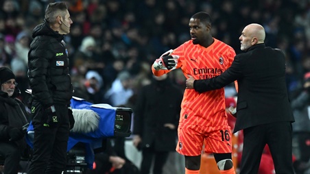 เหล่านักเตะ มิลาน พยายามปลอบอารมณ์ที่ข้างสนาม แต่ เมญอง ถอดถุงมือเดินลงอุโมงค์ ก่อนจะกลับออกมาแข่งต่อในอีก 5 นาทีต่อมา